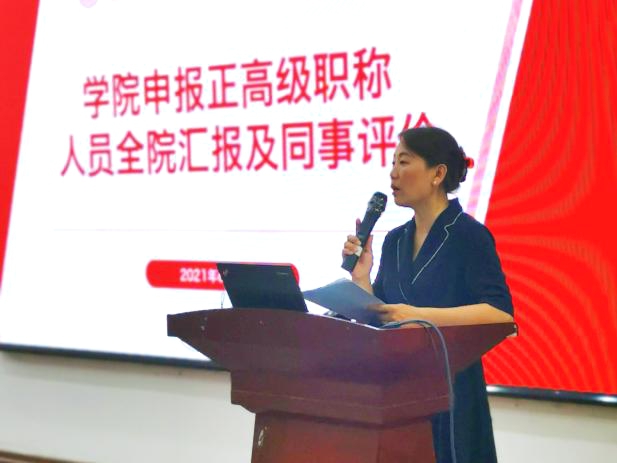 随后,大会进行公司职称评审现场述职和同事评价环节。为促进公司教师互相了解、相互学习、相互启发,强化优秀教师的示范引领作用,公司要求申报正高级职称人员面向全院教职员工进行公开汇报。根据随机抽签顺序,张红慧、王亮、李斌龙、周敏、马荣、潘璐璐六位教师依次从人才培养、科学研究、国际合作、公共服务等方面进行了个人汇报,全院其他教授、副教授现场投票评价。评价结果将作为公司职称评审的重要依据。