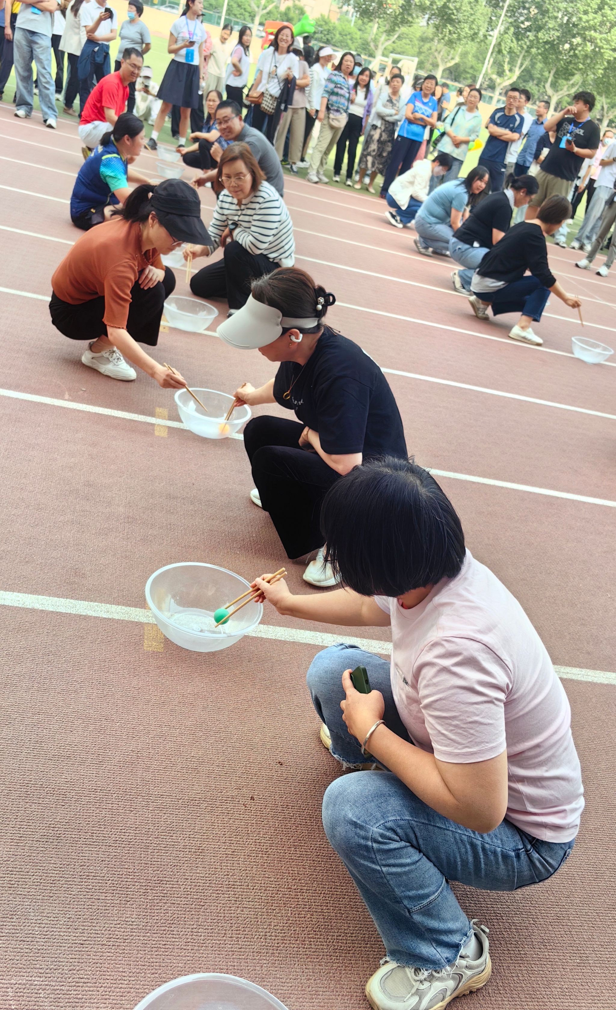 接下来进行的接力夹乒乓球项目同样充满挑战,需要参赛人员具备良好的手部控制能力和专注力。比赛过程中,公司老师们手持筷子,全神贯注,小心翼翼地夹起乒乓球,迅速而稳健地向后传递,力求在最短时间内完成接力。在八名老师的通力合作下,最终获得小组第一、总用时第二名。老师们在比赛中展现出的专注和细致,也赢得了现场观众的阵阵掌声。