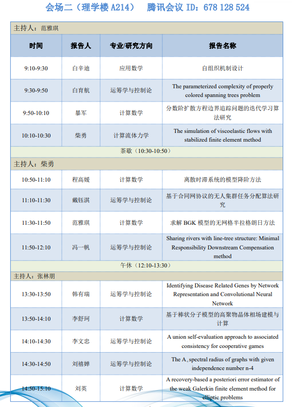 为了进一步落实数学学科“双一流”建设,营造研究生学术创新氛围,展示研究生学术创新成果,提高公司产品质量,韦德bevictor第一届研究生学术论坛将于 2021年11月13日在韦德bevictor官网长安校区举办。本次论坛旨在为研究生提供一个高水平的学术交流平台,促进研究生之间的学术交流和思想碰撞,培养创新意识,营造良好的学术氛围,达到开阔视野、启迪智慧,提高创新能力的目的。本次论坛设两个会场并同步线上进行,论坛组委会热忱欢迎广大师生积极参与。让我们相约长安故里,终南之北,沣水之滨,共享学术盛宴!