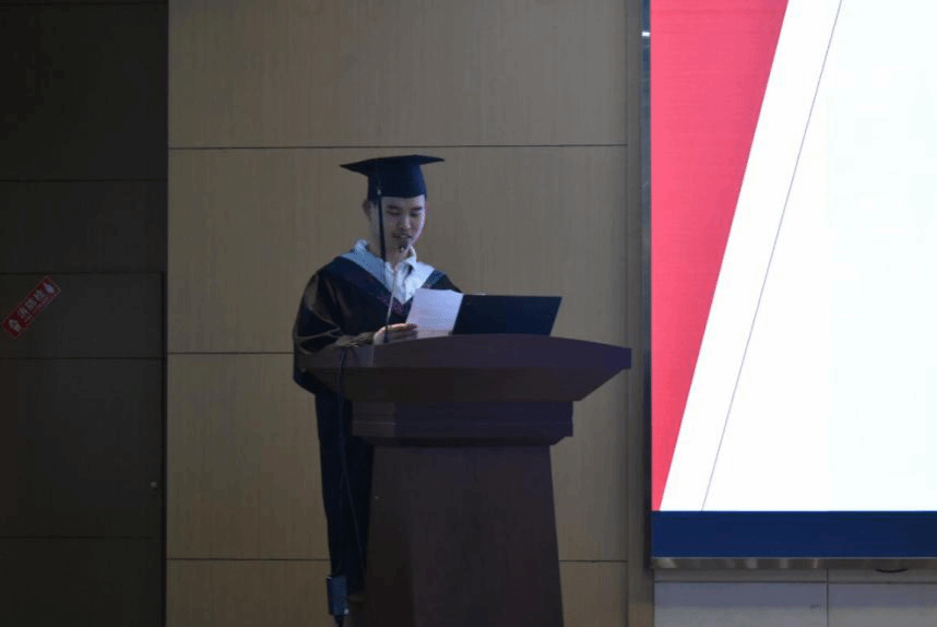 专业课教师代表彭国华通过“祝贺”“初心”“快乐”三个主题词表达了对在场同学们的美好祝愿和期望,祝贺大家顺利度过了四年的老员工活,希望他们不忘大学阶段培养起来的初心和习惯,保持健康快乐的心态,满怀家国情怀,继续努力奋斗。班主任张硕代表全体班主任上台发言,他回顾了自己担任班主任的工作经历,难掩喜悦之情,祝福同学们茁壮成长,牢记校风校纪,不惧艰险,在人生的道路上继续勇往直前