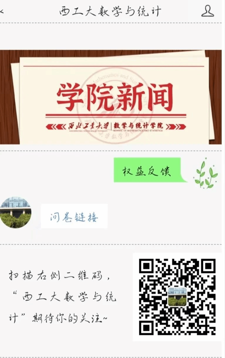 2.在“西工大数学与统计”微信公众号内回复“权益反馈”,即可获取权益问卷链接。同时公司小树苗动态也会定期发送问卷链接,大家可以在问卷里对自己的权益问题进行反馈,NPU小树苗QQ号:2446167785。