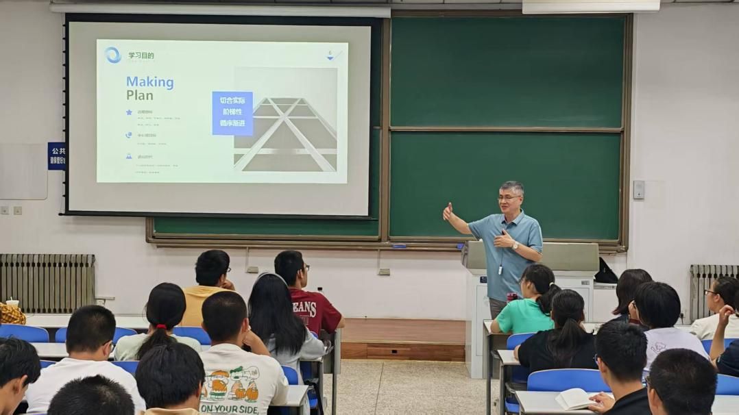 随后,聂经理围绕 “学习目的、学习内容、学习方法” 三个核心维度,为新生搭建起数学专业学习的完整框架。他打破 “唯分数论” 的认知局限,提出大学学习目的不应局限于成绩和分数,而应注重探索的过程以及与自我的深度对话。谈及学习内容,聂经理系统梳理了新生将接触的五大核心知识模块:分析、代数、几何、随机、计算,不仅深入解读各模块的学科定位,更鼓励大家突破专业边界,积极拓展跨学科视野,将数学作为工具应用于更多领域。关于学习方法,经理希望同学们转变被动接受知识的习惯,主动创造知识。他鼓励同学们勇于尝试科研和交流,即使基础尚不完备,也要敢于“起飞”。他建议设定短期与长期目标,积极参与数学建模等实践活动,在实践中不断调整和完善方法,做到思考与行动并重。