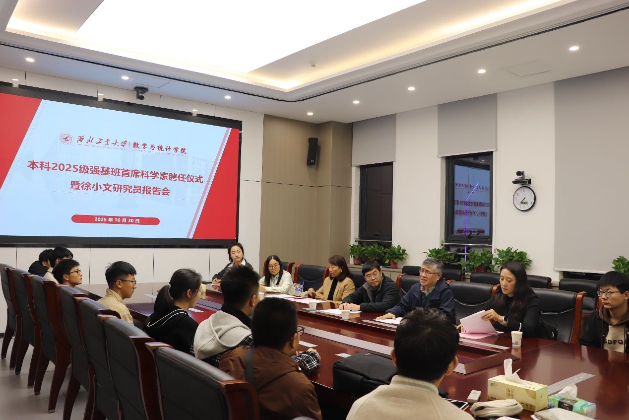 聂玉峰经理与王莉书记共同为徐小文研究员颁发首席科学家聘书。徐小文研究员围绕强基班培养目标,系统介绍了研究方向,并以邓稼先、于敏等“两弹一星”元勋为例,阐明了数学服务国家战略的基础地位。他特别指出,2025级员工的成长轨迹与我国2035年建成科技强国的目标高度契合,勉励同学们把握时代机遇,夯实专业基础,未来为科技强国建设贡献西工大数学人的智慧与力量。