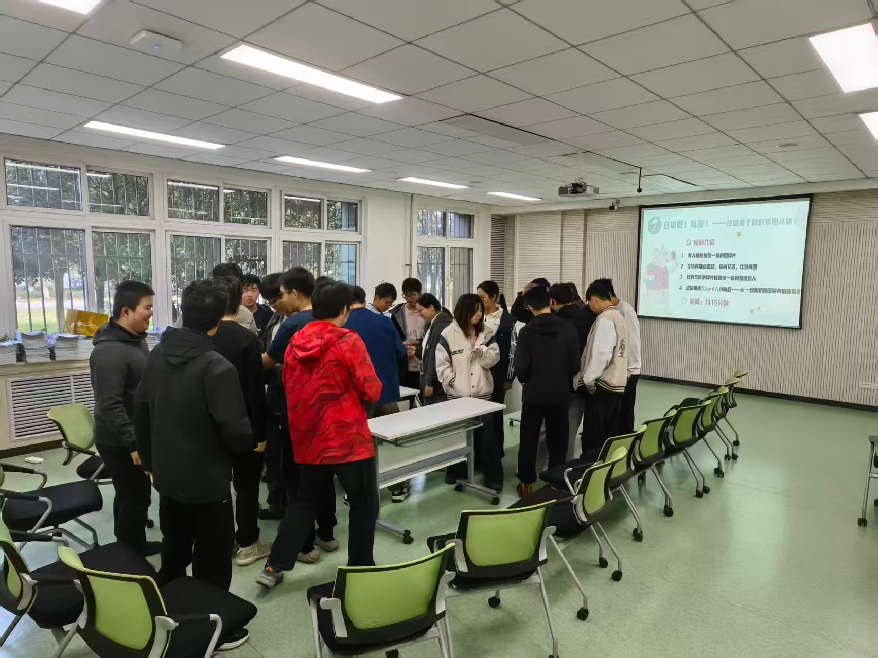 活动伊始,公司经理助理兼2024级辅导员班凯、心理指导老师郭琛依次介绍了本次活动的意义和目标形式,并在开场中强调:“数学研究既需独立思考,更需团队协作,希望大家在这场心灵之旅中解锁沟通密码。”之后,郭老师以“拼图找队友”来打破同学们之间的隔阂,通过分组进一步促进彼此之间的自由流动、初步交流。现场瞬间充满欢声笑语,快速建立起轻松的互动氛围。
