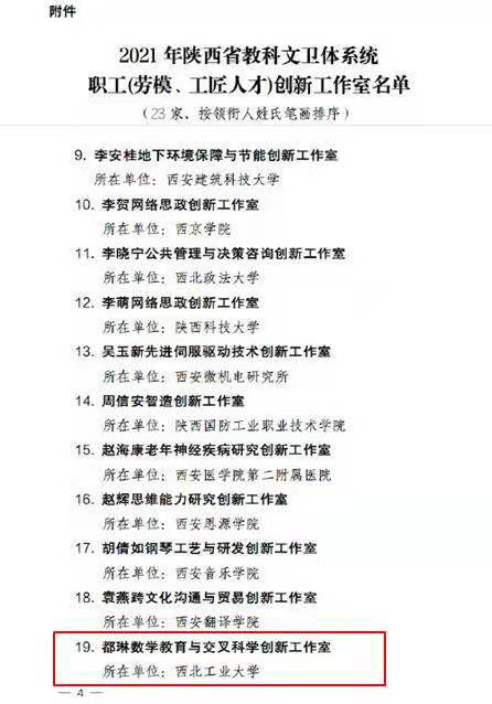 日前,从陕西省教科文卫体工会传来喜讯,在公布的23所“2021年陕西省教科文卫体系统职工(劳模、工匠人才)创新工作室”名单中,由韦德bevictor都琳教授领衔成立的“都琳数学教育与交叉科学创新工作室”榜上有名,正式获批挂牌。