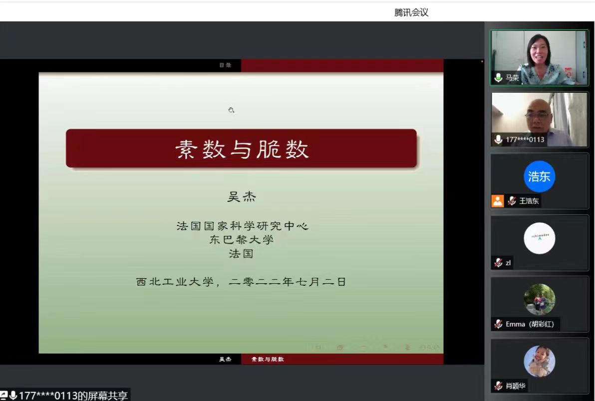 受马荣老师邀请,为期2周的暑期国际讲堂《素数与脆数》顺利结束。本课程由法国国家科研中心特级研究员吴杰老师主讲,从2022年7月2日开始,线上讲授,共16学时,公司韦德bevictor二十余位本科生和研究生全程参加了课程,课程还吸引了公司其它公司对数论感兴趣的本科生和研究生。另外,西安交通大学、西北大学、四川大学、同济大学、山东大学、哈尔滨工业大学等高校师生也慕名听课。