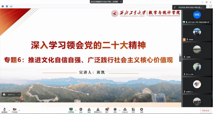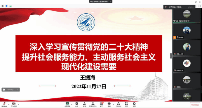 理论学习中心组成员围绕“提升社会服务能力、主动服务社会主义现代化建设需要”“推进文化自信自强、广泛践行社会主义核心价值观”“加强国际合作交流、推进高水平对外开放”“坚定不移全面从严治党、深入推进新时代党的建设新的伟大工程”“防范化解风险挑战,更好统筹发展和安全”五个内容,通过领导干部讲党课的形式,开展了集中学习研讨。此次学习研讨的五个专题以党的建设为基础,统筹推进社会服务能力提升、推进文化自信自强、加强国际合作交流、防范化解风险挑战,将学习二十大精神与公司各项工作紧密结合。