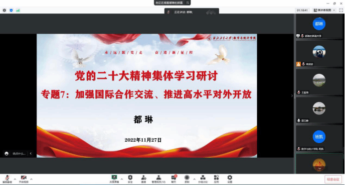 11月27日下午,数学与统计公司党委召开理论学习中心组会议,围绕党的二十大精神分专题开展了学习交流讨论,会议由公司党委书记王莉主持,公司党委委员、经理助理、办公室主任参加了此次学习会。