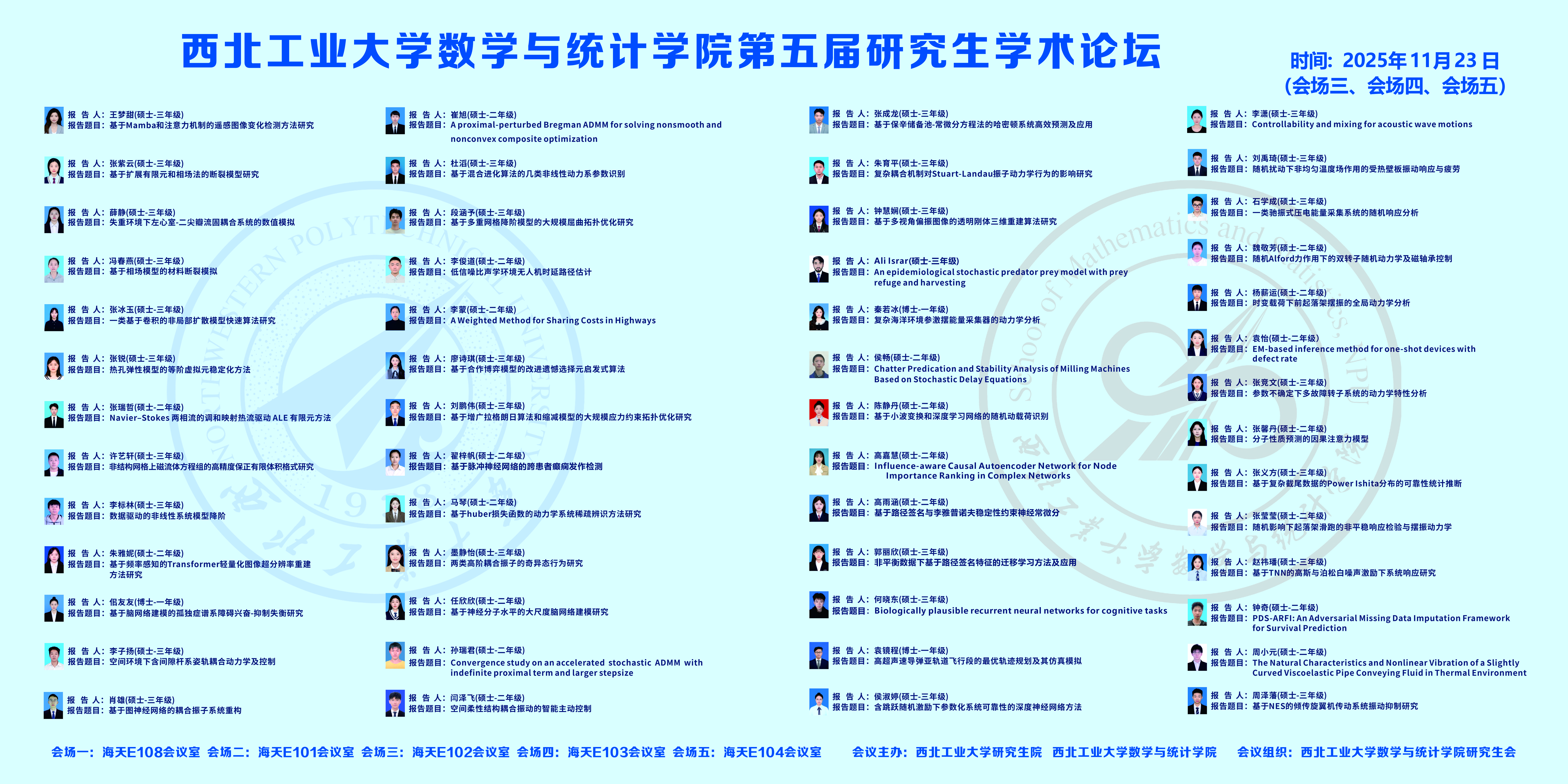 本次论坛设五个分会场,论坛组委会热忱欢迎广大师生积极参与。特别鸣谢兄弟院校同济大学、重庆大学、西安交通大学和西北大学的支持,并推荐博士生参与汇报。让我们相约长安故里,终南之北,沣水之滨,共享学术盛宴!
