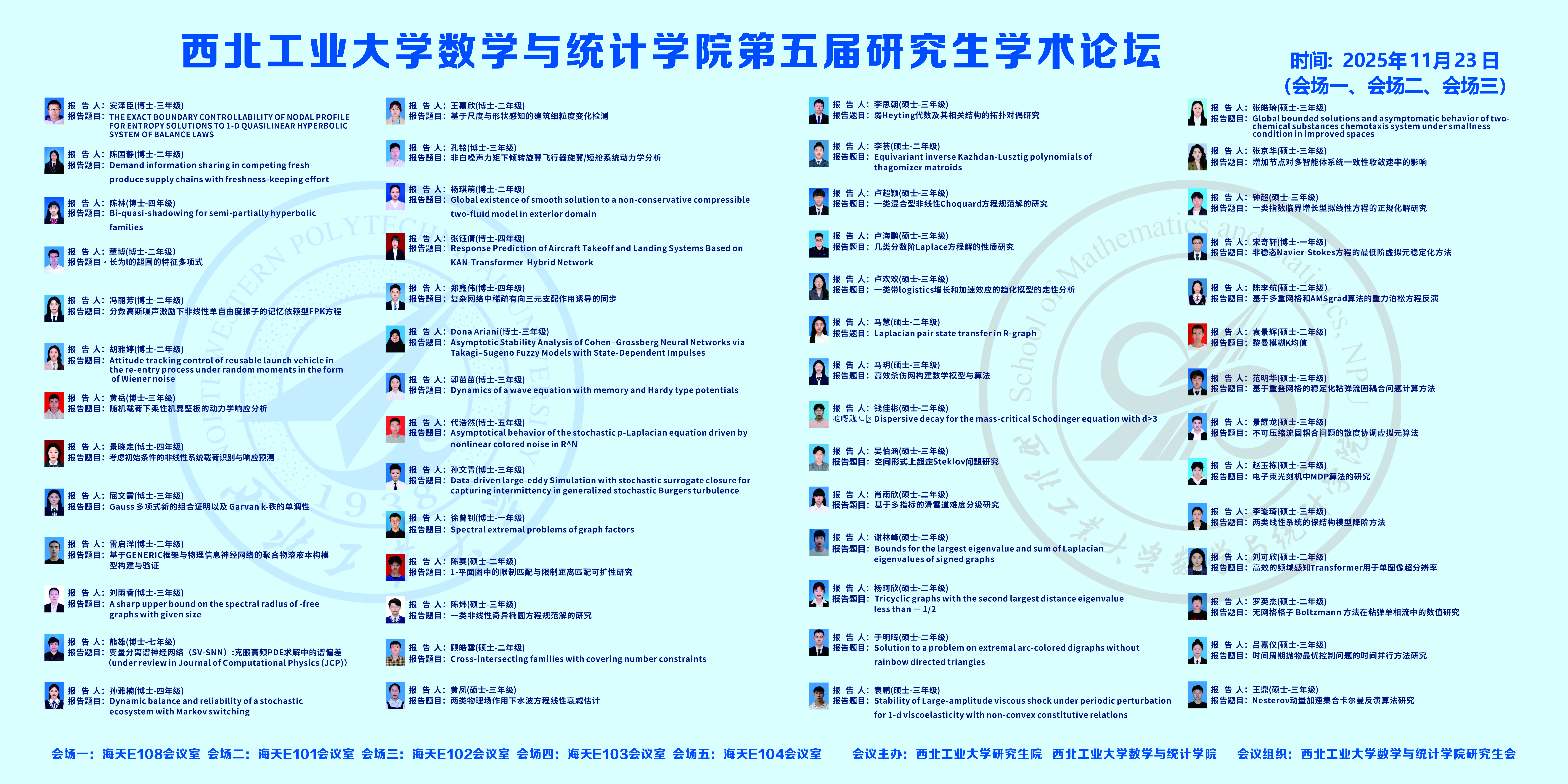 为了进一步落实数学学科“双一流”建设,营造研究生学术创新氛围,展示研究生学术创新成果,提高公司产品质量,韦德bevictor第五届研究生学术论坛将于2025年11月23日在韦德bevictor官网长安校区举办。本次论坛旨在为研究生提供一个高水平的学术交流平台,促进研究生之间的学术交流和思想碰撞,培养创新意识,营造良好的学术氛围,达到开阔视野、启迪智慧,提高创新能力的目的。