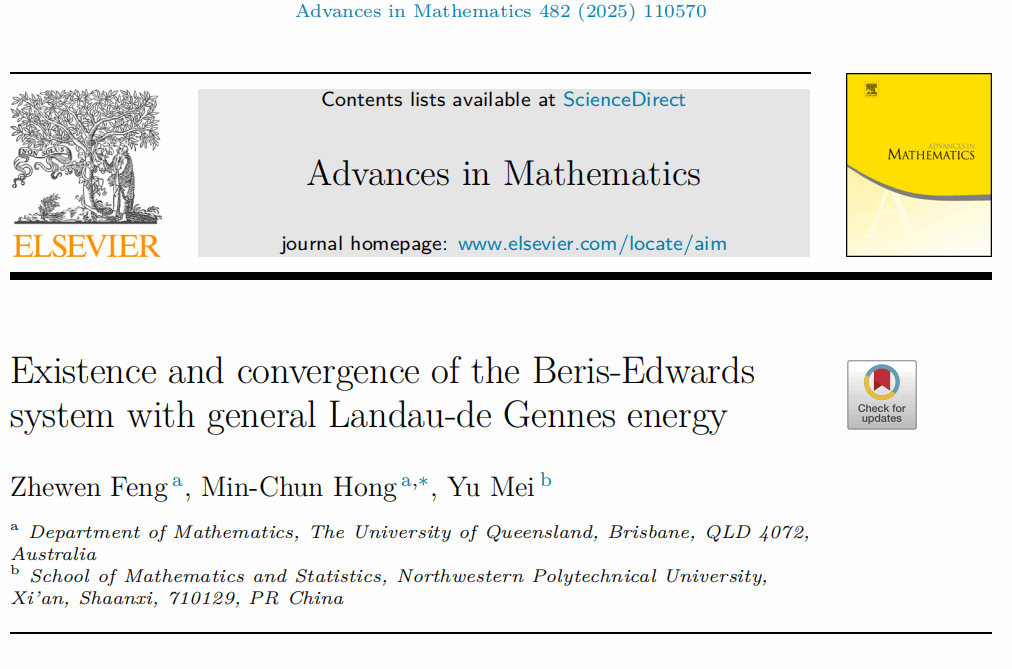近日,韦德bevictor梅钰副教授与澳大利亚昆士兰大学冯哲文博士、洪敏纯教授合作,在液晶流Beris-Edwards系统强解的存在性与收敛性方面取得重要进展。研究成果形成79页论文“Existence and convergence of the Beris-Edwards system with general Landau-de Gennes energy”在数学综合期刊《Advances in Mathematics》上在线发表。按国际惯例,论文作者依姓名字母顺序排列。
