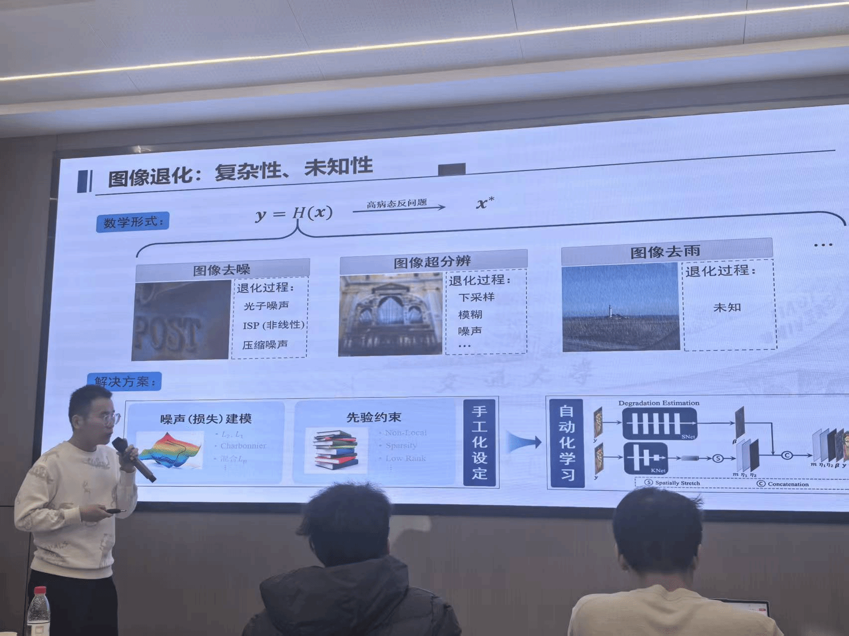 会议核心报告环节,四位专家学者带来了极具前沿性的学术分享。韦德bevictor官网栗帅教授以“基于生成模型的真实图像超分”为题,深入探讨了语义信息引导、变分自编码迁移学习及强化学习在图像超分辨率问题中的创新应用,为解决真实场景下的图像退化难题提供了新思路;西安交通大学王仁振助理教授针对半监督学习的分布偏差问题,介绍了偏差自适应分类模型与异方差伪标签建模方法,有效提升了模型在复杂环境中的泛化性能与稳健性;西安交通大学岳宗胜教授聚焦图像复原的“自动化”与“通用化”建模,其研究成果已成功应用于华为旗舰手机影像系统,实现了技术落地与产业赋能;西安交通大学王海林博士分享了融合低秩平滑的高维数据恢复研究,提出的全新建模方法在图像视频处理、异常检测等多领域展现出优越性能。报告结束后,与会嘉宾围绕研究热点、技术难点展开深入研讨,形成了多项建设性共识。