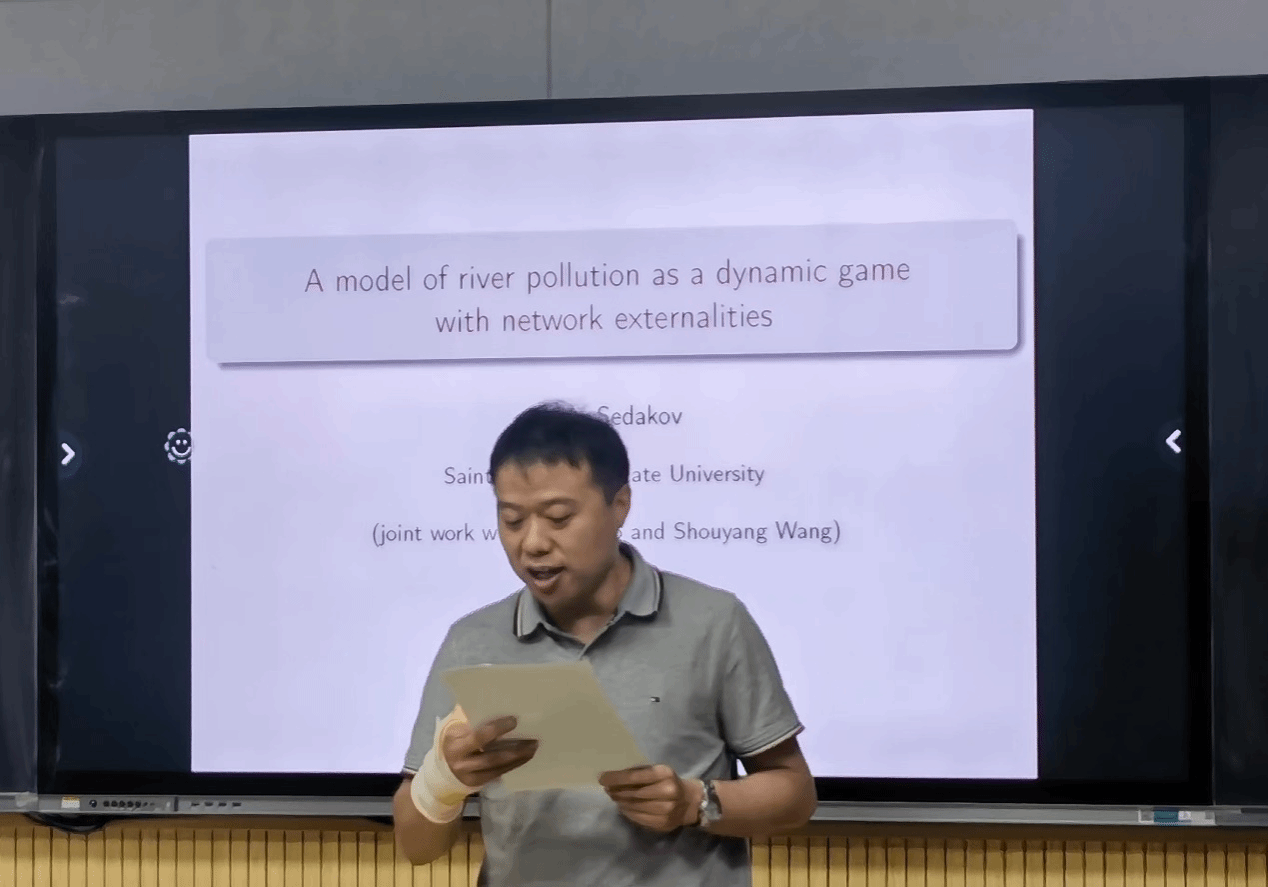 Artem Sedakov教授的报告以河流污染治理问题为背景,构建了具有网络外部性的动态博弈模型,其中每个节点(参与者)的状态变量受其自身决策和网络中前继节点决策的影响。针对参与者的非合作和合作行为,分别探讨了博弈的纳什均衡策略及合作策略,进一步讨论了参与者不考虑未来收益的短视均衡和短视合作下的模型及策略,并详细分析比较了均衡行为和合作行为不同策略及收益。报告期间,Artem Sedakov教授与团队师生围绕相关问题进行了深入交流。