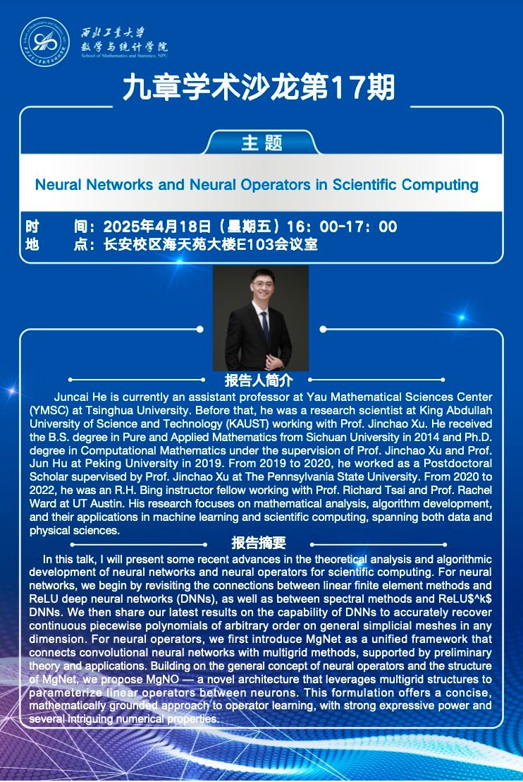 Juncai He is currently an assistant professor at Yau Mathematical Sciences Center (YMSC) at Tsinghua University. Before that, he was a research scientist at King Abdullah University of Science and Technology (KAUST) working with Prof. Jinchao Xu. He received the B.S. degree in Pure and Applied Mathematics from Sichuan University in 2014 and Ph.D. degree in Computational Mathematics under the supervision of Prof. Jinchao Xu and Prof. Jun Hu at Peking University in 2019. From 2019 to 2020, he worked as a Postdoctoral Scholar supervised by Prof. Jinchao Xu at The Pennsylvania State University. From 2020 to 2022, he was an R.H. Bing instructor fellow working with Prof. Richard Tsai and Prof. Rachel Ward at UT Austin. His research focuses on mathematical analysis, algorithm development, and their applications in machine learning and scientific computing, spanning both data and physical sciences.