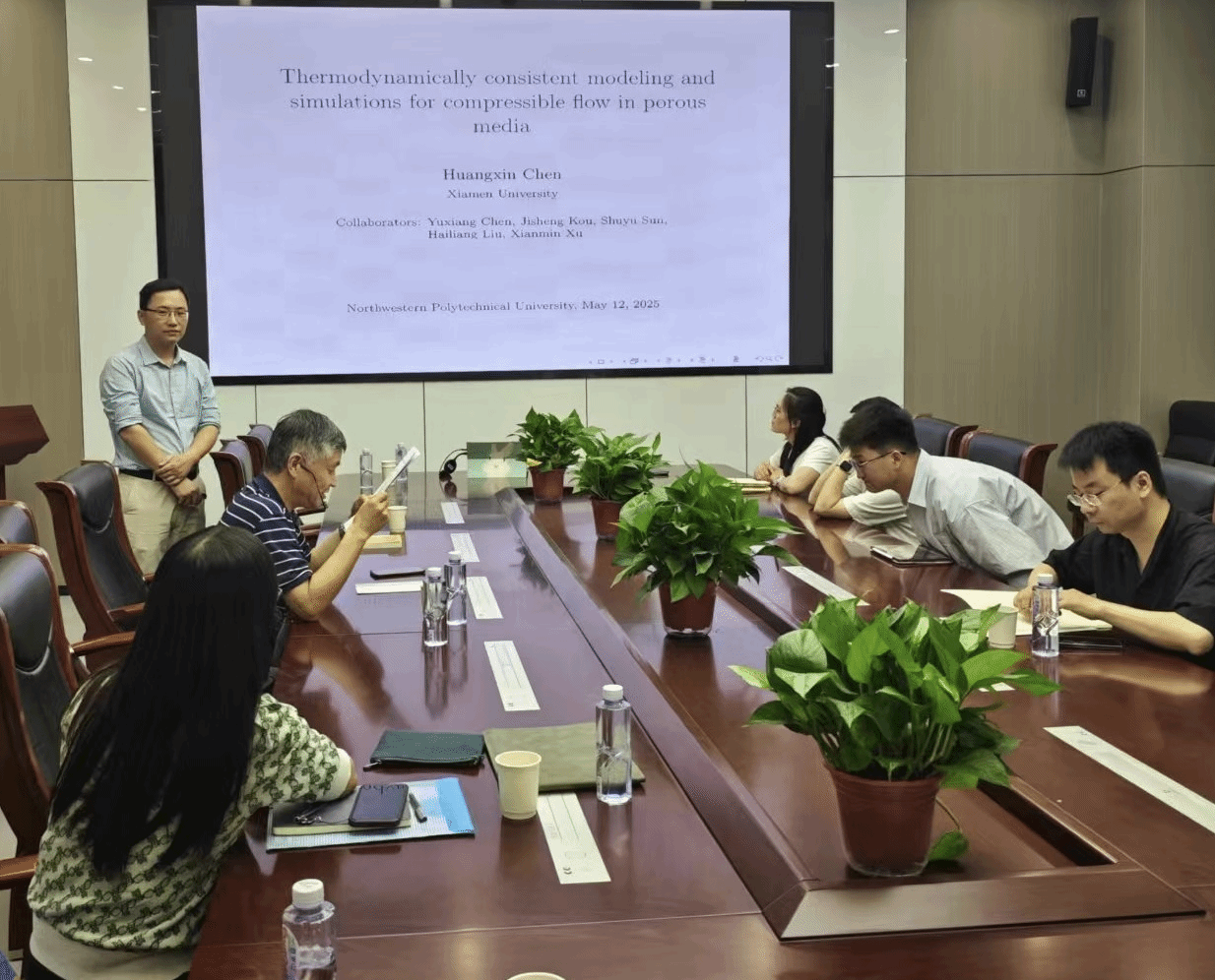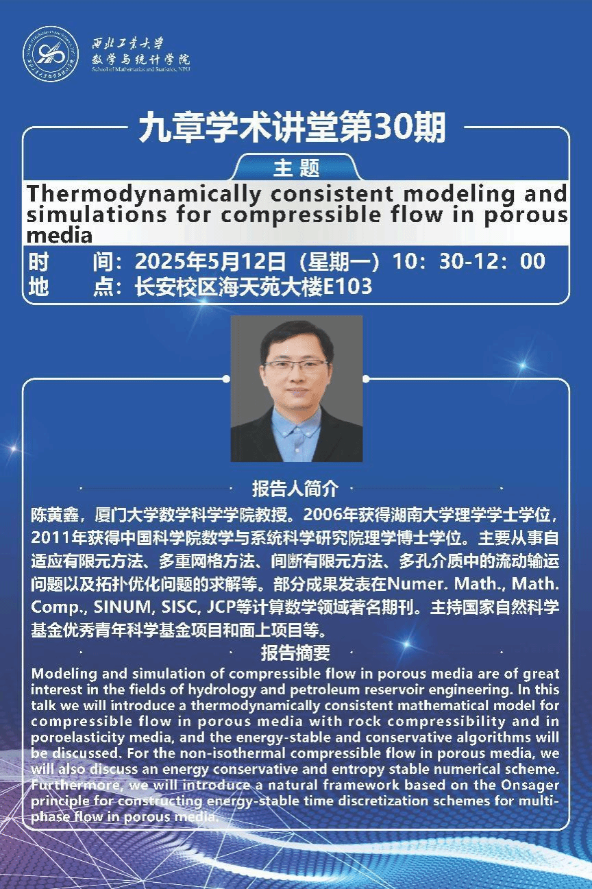 2025年5月12日,韦德bevictor邀请厦门大学陈黄鑫教授做客“九章学术讲堂”第30期,为公司师生作了题为《Thermodynamically consistent modeling and simulations for compressible flow in porous media》的精彩学术报告。报告在长安校区海天苑大楼E103会议室举行,韦德bevictor聂玉峰教授、杨宗泽教授等近30名师生参加了报告会,报告会由聂玉峰主持。