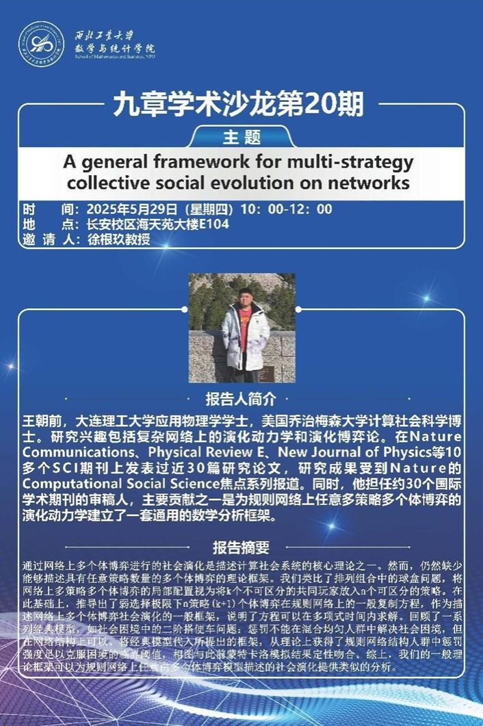 王朝前,大连理工大学应用物理学学士,美国乔治梅森大学计算社会科学博士。研究兴趣包括复杂网络上的演化动力学和演化博弈论。在Nature Communications、Physical Review E、New Journal of Physics等10多个SCI期刊上发表过近30篇研究论文,研究成果受到Nature的Computational Social Science焦点系列报道。同时,他担任约30个国际学术期刊的审稿人,主要贡献之一是为规则网络上任意多策略多个体博弈的演化动力学建立了一套通用的数学分析框架。