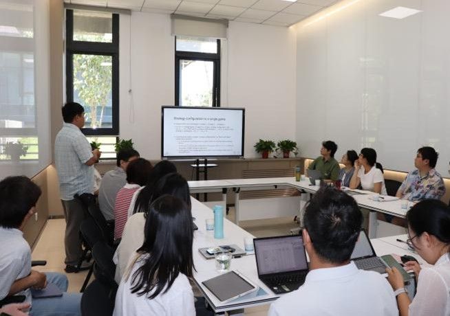 王朝前长期专注于计算科学领域,研究方向包括复杂网络上的演化动力学和演化博弈论。此次报告中,他首先介绍了网络多主体博弈理论难以适配复杂策略场景这一难题,随后通过回顾经典“二阶搭便车问题”,引入了排列组合思维。最后将其作为描述网络多个体博弈论演化的一般框架,成功推导出弱选择极限下通用复制动态方程,有力证实了新框架在复杂系统分析中的可靠性与有效性,实现了多项式时间的高效求解。