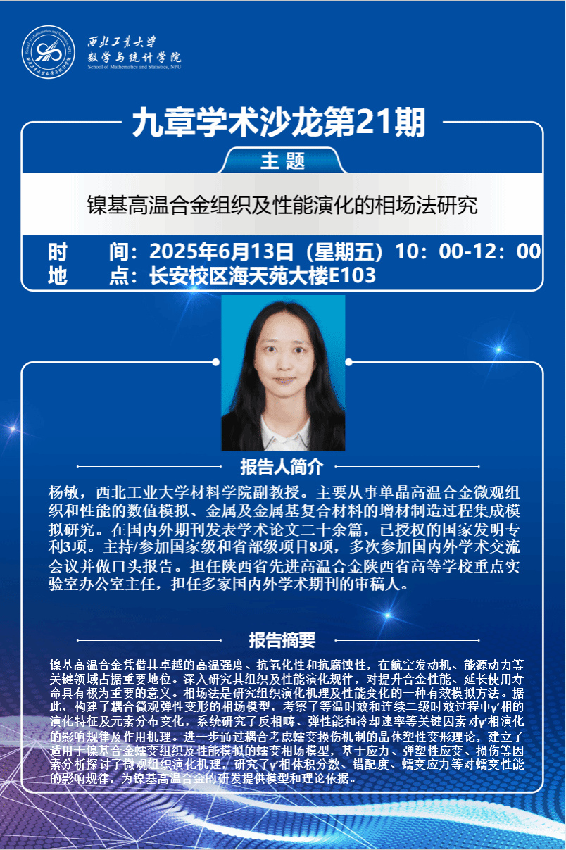 2025年6月13日,应韦德bevictor副经理都琳教授及王晓东教授邀请,材料公司杨敏副教授在海天苑大楼E103会议室作了题为《镍基高温合金组织及性能演化的相场法研究》的学术报告。公司近20位师生参会共探学术前沿,报告由都琳主持。