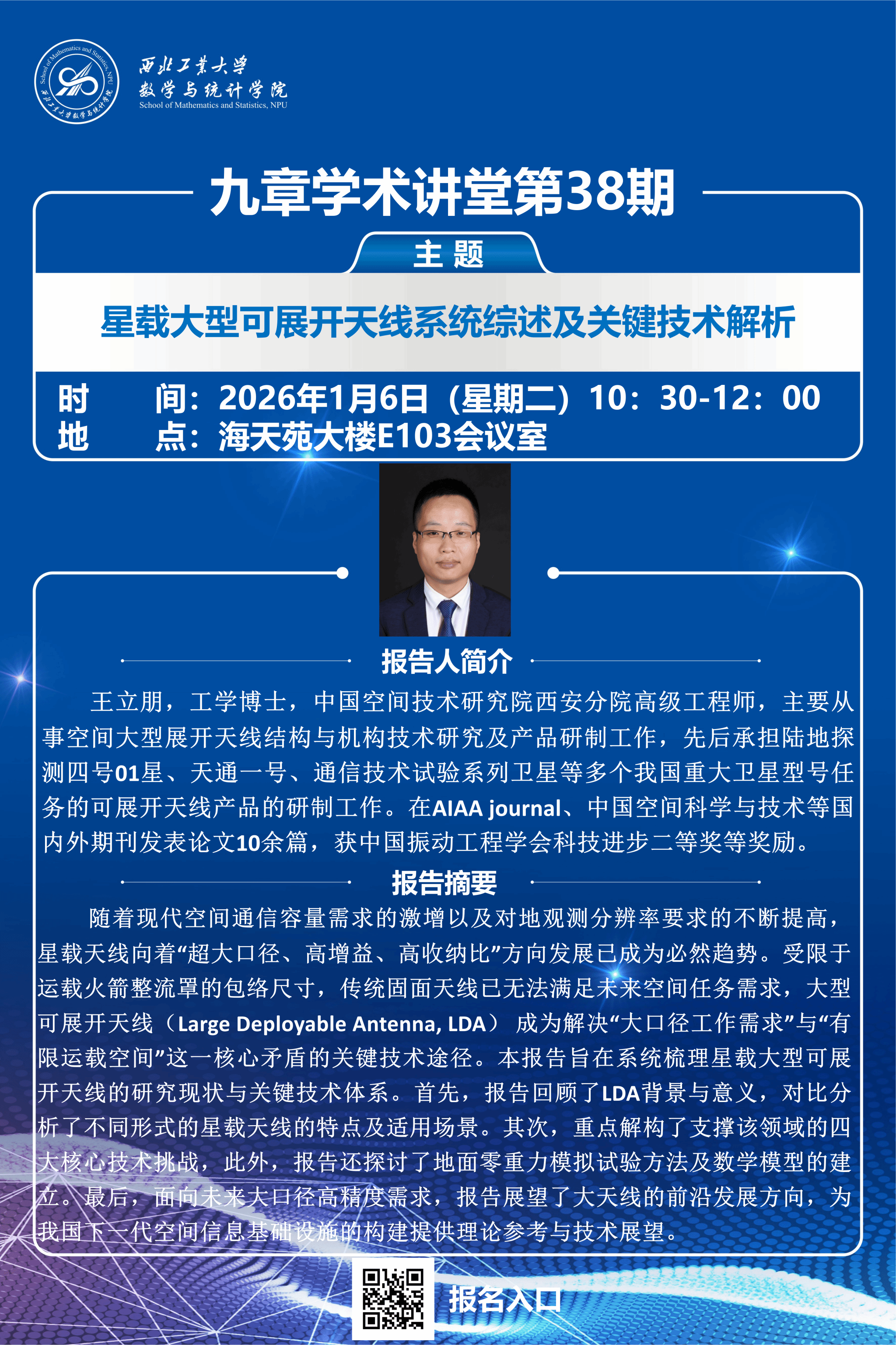 2026年1月6日上午,韦德bevictor第38期“九章学术讲堂”在海天苑大楼E103会议室成功举办。本期讲堂特邀中国空间技术研究院西安分院高级工程师、工学博士王立朋担任主讲,以“星载大型可展开天线系统综述及关键技术解析”为主题,为韦德bevictor相关专业师生带来一场聚焦航天工程前沿的深度分享。