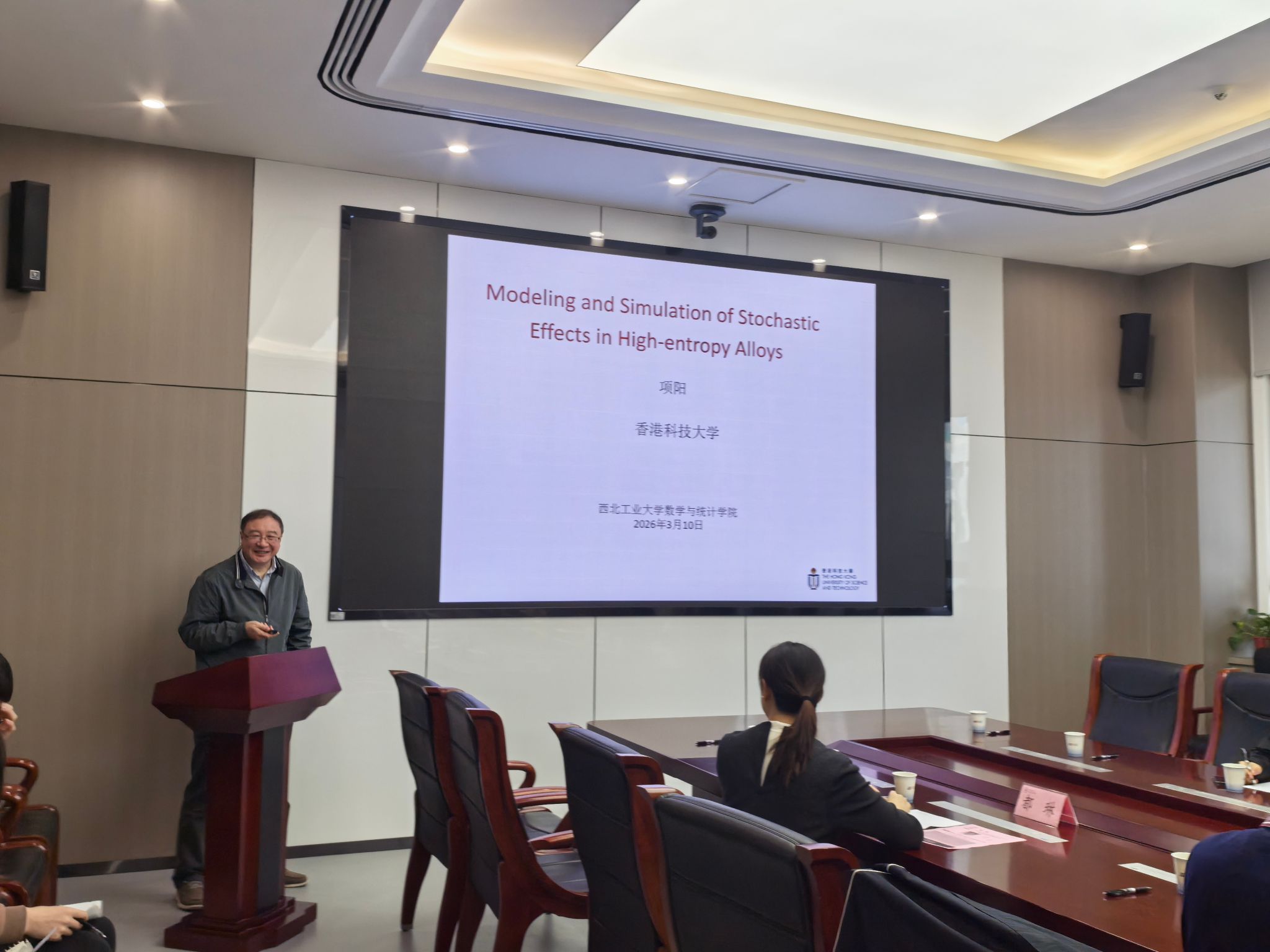 项阳在报告中围绕高熵合金这一新型材料中的随机效应问题,介绍了相关的数学建模思路与研究进展。他从原子层面的随机固溶体结构出发,在经典的 Peierls–Nabarro 位错理论框架下建立了描述位错运动的随机连续介质模型,从数学建模角度揭示了随机原子结构对材料力学性能的影响机制。报告还展示了团队近期发展的机器学习方法,用于探索高熵合金化学成分与材料性能之间的复杂关系。报告内容深入浅出,将严谨的数学分析与具体材料问题紧密结合,展现了应用数学在前沿材料科学研究中的重要作用。