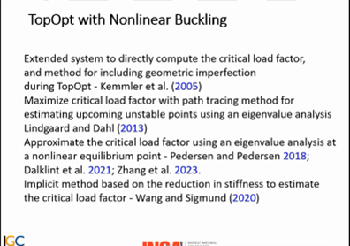 在接下来的课程中,Balaji Raghavin教授在之前的基础上建立了屈曲条件下的有限元单元矩阵以及如何在屈曲条件下进行灵敏度分析。随后Balaji Raghavin教授介绍了对于线性屈曲和非线性屈曲拓扑优化领域内的一些重要文章的基本思想,鼓励员工们进行更加深入的探索。