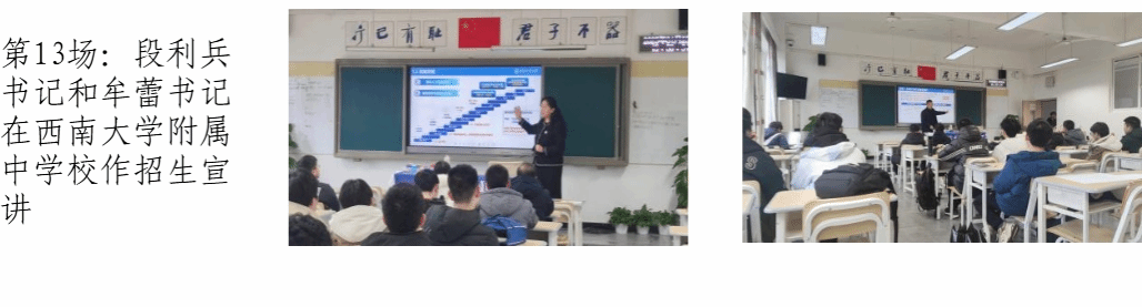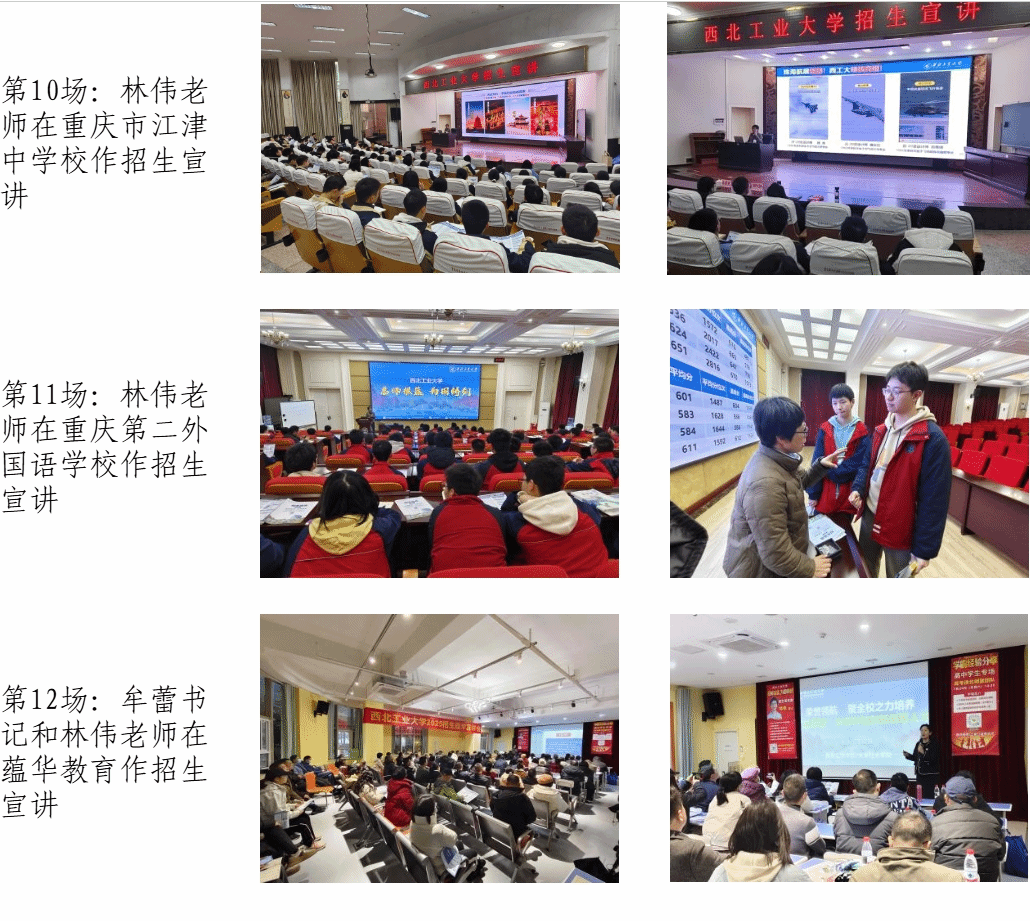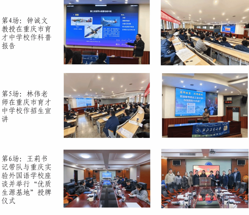 为深化大学与中学之间的教育协作,打造“总师型”人才教育合作共同体,充分发挥中学作为重要生源基地的关键作用,持续提升公司声誉,2025年1月20日至25日,由数学与统计公司党委书记王莉、副经理郭千桥、重庆招生组组长林伟、招生秘书李彦吉及生命科学与医学学部党委书记段利兵、教育实验公司党委书记牟蕾、航空公司钟诚文教授等组成的联合招生宣传组先后赴重庆市璧山中公司、重庆巴蜀科学城中公司、重庆市育才中公司、重庆实验外国语公司、重庆市江津中公司、重庆第二外国语公司、西南大学附属中公司等7所中学及蕴华教育等教育机构举行招生宣传活动计13场,包括3场科普报告、7场招生宣讲、3场“优质生源基地”授牌活动。