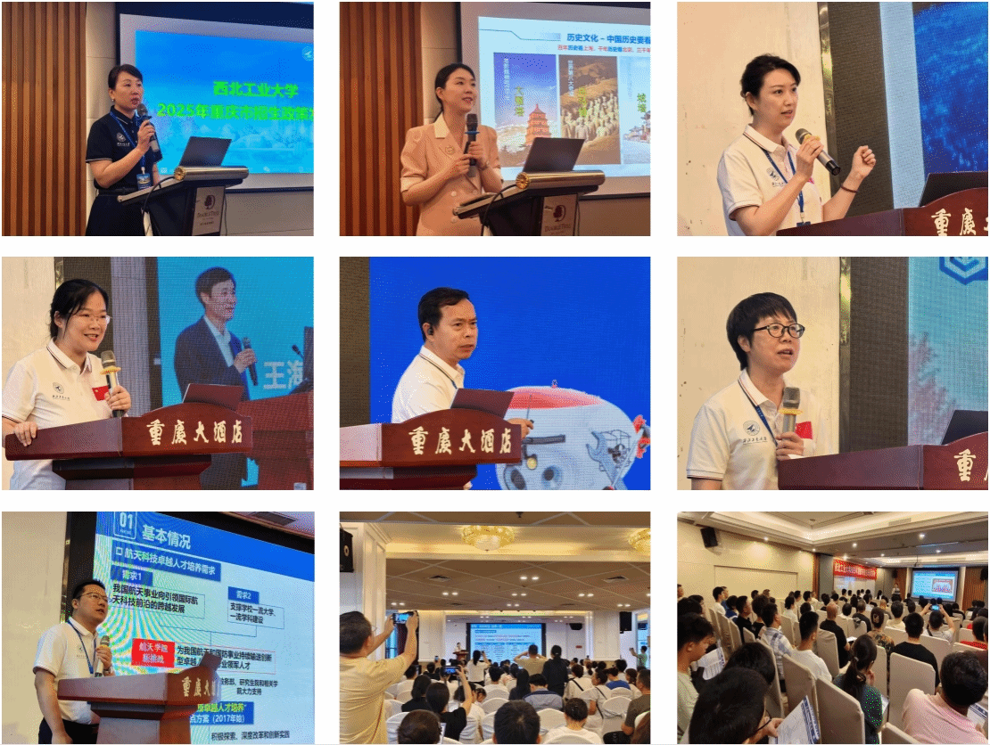 6月14日-15日,在重庆连续组织两场西工大招生政策宣讲会和一场家长见面会,航天公司校金友,航海公司闫永胜,伦敦玛丽女王大学工程公司副经理程茵,教育实验公司/未来技术公司南云,数学与统计公司党委副书记张莹、副经理郭千桥、经理助理刘晓刚和林伟老师分别汇报特色班培养模式。王睿璇和李彦吉在现场为考生及家长提供了专业、热情的咨询服务。